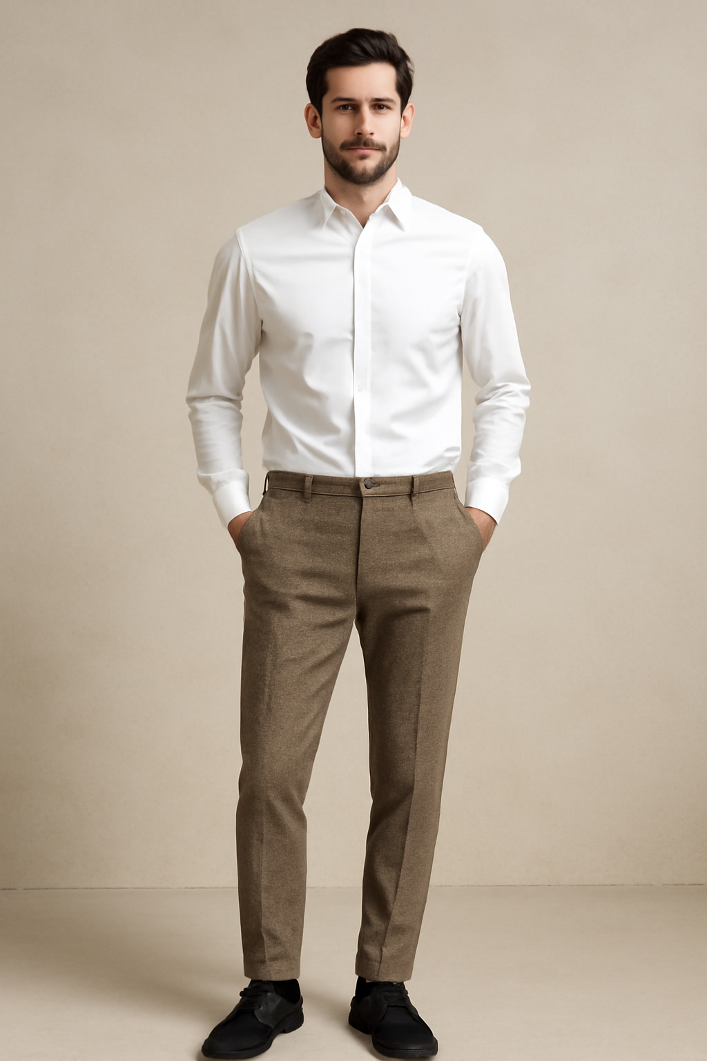 Classic taupe color with warm tawny undertones, versatile for pairing with various shirt and shoe combinations